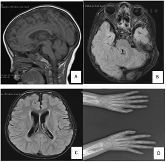 血常规、肝肾心功、丙酮酸、乳酸、同型半胱氨酸、甲状腺功能、血、尿代谢筛查均未见异常。头颅磁共振成像(magnetic resonancei maging,MRI)平扫示双侧额颞部蛛网膜下腔略宽,内部血管流空信号稍多,双侧眼眶外侧壁及周围软组织内见多发迂曲线状异常信号。右额叶点状FLAIR稍高信号--髓鞘发育不良;左顶叶片状FLAIR高信号,考虑脱髓鞘改变(图1A~C)。脑干诱发电位示ABR:左侧70dB Ⅲ-V峰间期>I-Ⅲ峰间期,V波波幅<I波波幅1/2波形差,Ⅲ波波幅明显低,波形较差,右侧70dB各波潜伏期及峰间期均正常,V波波幅<I波波幅1/2波形差,Ⅲ波波幅明显低,波形较差,双侧阈值20dB;ASSR:双侧阈值20dB;FVEP:双侧未见明显异常。心脏彩超:房间隔缺损Ⅱ型,二尖瓣少量返流。双手正位片:双侧拇指远节指骨骨骺形态欠佳(图1D)。双髋关节正位片:未见明显异常。24小时视频脑电图:正常。精神科B类量表评定:运动相当于18个月龄,社会适应相当于18月,智力相当于11月,原始总分47分,DQ<47分,MI<44。