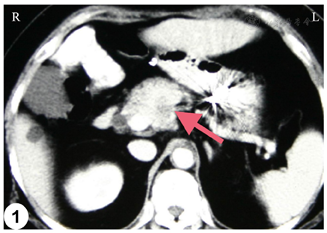 腹部超声提示胰颈前上方可见一3.6 cm×2.9 cm低回声肿块,边界不清,形态不规则;此外,提示胆总管轻度扩张以及胆囊多发结石。腹部强化CT提示胰腺颈部与胰头交界处可见不均匀强化团块,与肝总动脉关系密切(图1)。