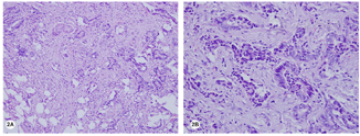 结合胸部CT和胃镜,可初步排除胃癌复发和转移。综合影像学报告和辅助检查,初步诊断为胰腺癌、胆囊结石和胆囊炎。术中超声显示肿瘤大小为4.0 cm×3.5 cm,包绕并侵犯肝总动脉根部;肿瘤经穿刺活检证实为低分化PDAC(图2)。