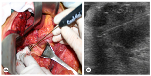 患者来本院寻求手术治疗,遂决定行开腹手术。开腹探查发现胰颈部可见一质硬实性肿块,向胰腺上缘突出。结合术中情况,患者无胃癌复发迹象,肿瘤与肝总动脉、肝固有动脉及胃十二指肠动脉关系密切,考虑难以行手术切除,因此决定行术中超声引导下RFA治疗。Kocher钳游离胰头和十二指肠。患者曾接受过根治性胃切除术,因此游离胰腺上缘的膜性粘连。分离肝十二指肠韧带右缘,冷湿纱布覆盖周围组织器官,充分暴露胰头和胰颈。采用Cool-tip™ RFA系统以及冷循环电极(17-gauge)(图3A)。然后在术中超声引导下将射频电极精确地插入肿瘤内(图3B)。启动后设置手动功率输出,从40 W开始,随后将功率以10 W/min速率增加,以90 W的最大功率进行肿瘤消融,共消融3点次(每次6~10 min)。于胰体及winslow孔置管引流(图4)。术后予以抗感染,抑酸,抑制胰腺分泌对症支持治疗。