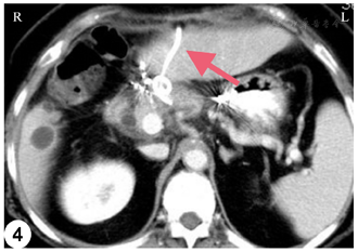 本例患者在RFA后2次出现胰瘘,第2次手术后出血,表明消融后并发症概率仍然很高。本例术后胰瘘是由于RFA术后胰液从微小胰管漏出所致,开腹RFA后置管引流并保持通畅至关重要。据报道可以通过烧灼针道、在创面喷洒蛋白凝胶和使用生长抑素来预防胰瘘的发生[14]。值得注意的是,RFA引起的胰瘘在主胰管畅通的情况下,经保守治疗可在1个月内得到控制。根据文献报道,有2个高危因素可能导致RFA术后出血,一是RFA治疗过程中可能会损伤血管;另一个原因是RFA导致胰管破裂,造成胰液渗出腐蚀周围血管形成出血[15,16]。一项较早的研究报道16例局部进展期胰腺癌患者接受RFA,存在相对较多并发症,包括:胰瘘、急性胰腺炎、十二指肠溃疡以及门静脉血栓形成等,且死亡率约为25%[16]。因此,仍需要更大样本量的前瞻性研究用于探索消融后并发症相关的影响因素。