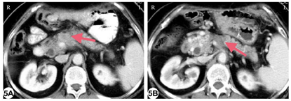 术后第11天患者并发胰瘘,引流管中持续引出胰液,颜色尚清,最大量接近500 ml/d。后出现引流不通畅情况,给予患者经皮经肝穿刺置管引流、禁食禁水、胃肠外营养等治疗。患者恢复顺利,于术后第44天带管出院。1个月随访增强CT肿瘤完全灭活。手术后约8个月随访增强CT显示胰体局部肿瘤复发以及脾静脉受累(图5A)。患者一般情况良好,无肿瘤远处转移。患者于11月17日再次接受开腹RFA,在IOUS引导下将射频电极精确置入肿瘤,手动射频条件与先前相同,进行两点次消融(分别为8、6min)。术后患者再次出现胰瘘,引流通畅,随后并发腹腔出血,通过介入栓塞治疗后停止。腹腔引流逐渐减少,拔除引流管后无不适,患者出院。患者在术后8年状况良好,无肿瘤复发迹象(图5B)。