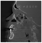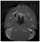 一般情况良好,心肺腹检查未见明显异常。专科检查:上唇正中及左侧鼻旁明显隆起,按压乒乓球样感。口内见12-23前庭沟处隆起,大小约4.2 cm×2.0 cm,边界清,轻微压痛,22-24腭侧球形膨隆,大小约1.5 cm×1.5 cm,边界清,质软,可触及波动感,无压痛。22唇侧有一瘘管,挤压有脓液溢出。鼻腔检查见鼻腔黏膜充血,左侧鼻底及下鼻道隆起,下鼻甲被挤压向外上方。