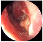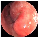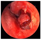 口腔检查:口腔颌面部左右不对称,左侧鼻旁区明显隆起,按压乒乓球样感,双侧颞下颌关节无弹响,无压痛。口内见12-23前庭沟处膨隆,大小约4.2 cm×2.0 cm,边界清,质软,有轻微压痛,22-24腭侧球形膨隆,大小约1.5 cm×1.5 cm,边界清,质软,可触及波动感,无压痛。22唇侧有一瘘管,挤压有脓液溢出。鼻内镜检查:鼻腔黏膜略充血,左侧鼻底及下鼻道见明显隆起(图4),将左侧下鼻甲推向外上方,鼻中隔向右侧偏曲,左侧鼻道较宽敞,中鼻道略隆起,未见分泌物。CBCT示:12-24根尖区可见3.7 cm×1.6 cm大小的低密度影像,边界清楚,密度均匀,内见不完全的骨间隔影,肿物累及左侧鼻底及鼻腔外侧壁,左侧上颌窦内见液平面。