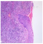 入院后完善术前常规检查,于次日在局麻下行切开引流术,阿替卡因肾上腺素行21-22前庭沟黏膜下局部浸润麻醉,麻醉显效后,自21-22前庭沟处切开黏膜及黏膜下层至囊腔约3 mm水平切口,见大量黄色分泌物溢出,取部分脓液做细菌培养,大量生理盐水冲洗至冲洗,留置橡皮引流条,术后常规予以抗生素控制感染。4 d后检查前庭沟切口处已愈合。经耳鼻咽喉科与口腔颌面外科会诊,决定行鼻内镜下左侧鼻底、下鼻道共同开窗肿物切除术。术中先用彭氏电刀电凝左侧鼻底及下鼻道隆起处黏膜(图5),剥离子自隆起处外侧刺破黏膜进入囊腔,见大量囊液流出,囊液呈浅褐色,略浑浊,吸净囊液后,向后扩大开窗口,保留后部黏膜瓣。剥离部分囊壁送病理检查,清除病变组织后,发现位于囊腔前下壁的不完全的骨间隔隆起(图6)。剥离子在囊肿的左侧上部探查见上颌窦内下骨质缺损,由此刺破软组织进入上颌窦,见有黏液涕流出,扩大上颌窦开窗口,动力系统清除病变组织,使囊肿腔与上颌窦形成一个腔(图7),修剪后部蒂瓣,使之正好贴敷于囊腔后壁(图8),反复生理盐水冲洗术腔,检查无残留,膨胀海绵填塞。手术过程见视频。手术顺利,术后继续行抗生素控制感染,48 h抽出鼻腔膨胀海绵,检查见鼻底及上颌窦开窗口开放良好,腔内有少许血性分泌物,黏膜略水肿。术后病理镜下见被覆鳞状上皮,间质内见急慢性细胞浸润(图9)。术后4 d患者康复出院。