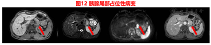 此次MRI检查发现胰腺尾部异常占位(图12),考虑为神经内分泌瘤,入院后手术确诊为胰腺神经内分泌瘤,G2。因此患者从初步诊断为肝内原发性神经内分泌瘤并肝内转移修正为胰腺神经内分泌瘤并肝内多发转移。