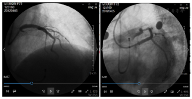 冠脉造影示三支血管病变、前降支动脉瘤形成。