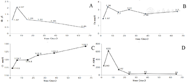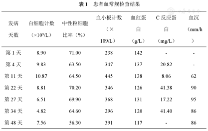 | 发病天数 | 白细胞计数(×109/L) | 中性粒细胞比率(%) | 血小板计数(×109/L) | 血红蛋白(g/L) | C反应蛋白(mg/L) | 血沉(mm/h) |