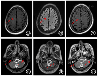 入院体格检查:T 36.5℃,P 66次/min,R 17次/min,BP 210/110 mmHg(1 mmHg=0.133 kPa)。内科体格检查未见明显异常。神经系统体格检查:意识模糊,体格检查不合作。双侧瞳孔等大等圆,直径约3.0 mm,对光反射存在,双侧鼻唇沟对称,伸舌不合作。四肢可自主活动,肌张力正常,双侧病理征阳性。感觉及共济运动检查不合作。脑膜刺激征阳性。根据病史、查体及辅助检查,定位:脑膜、脑实质、听神经,定性:炎症性。入院诊断:(1)头晕原因待查(中枢神经系统感染?);(2)多发腔隙性脑梗死;(3)高血压病;(4)糖尿病;(5)右下肢静脉曲张。