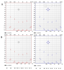 第3天,颅脑MR平扫双侧基底节、双侧额顶叶内见多发斑点状略长T1、略长T2信号,FLAIR序列呈略高信号,双侧乳突未见明显异常(图2)。第5天,行纯音听阈测定结果显示双耳为混合性聋,考虑急性感染、炎症导致听神经损伤(图3A)。第6天,未再发热,意识模糊稍减轻,复查脑脊液示总蛋白2.07 g/L,葡萄糖3.36 mmol/L,氯化物119.7 mmol/L;有核细胞计数620×106/L,中性粒细胞占比0.3,淋巴细胞69%,单核细胞1%(图1)。第10天,脑脊液nGS回报猪链球菌(序列数1889,相对丰度93.27%),请临床药师会诊:患者有生肉类接触史,不排除在处理过程中皮肤黏膜有破损细菌入血可能,结合早期发热、意识模糊症状,脑脊液感染象,考虑猪链球菌为致病菌,猪链球菌脑膜脑炎诊断明确。