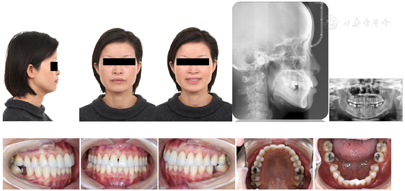 牙周基础治疗;减数14、24,中支抗,内收上下前牙改善侧貌;直立前移下后牙,下颌缺牙间隙配合牙周骨增量手术尝试关闭。