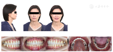 像矫治结束后面像显示患者侧貌改善明显,鼻唇角恢复正常,颏部形态有所改善。口内像显示上下前牙覆