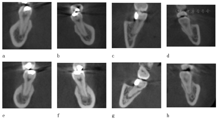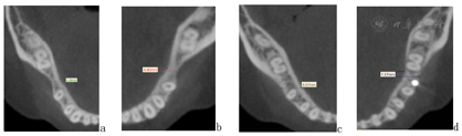 曲面断层片:36、46缺失,37、47近中倾斜,16、24、26、34、37、47充填体影像;上下颌前牙区牙槽骨萎缩至根中1/3,双侧升支长度、髁突大小形态基本对称。头影测量片:骨性I类均角,上前牙唇倾、下前牙舌倾(图1),具体结果见表1。锥形束CT冠状位下颌第二磨牙釉牙骨质界高度截图显示:下颌第一磨牙缺隙处牙槽嵴狭窄,牙槽骨颊舌向厚度右侧为4.78 mm,左侧为4.40 mm(图7a、b)。