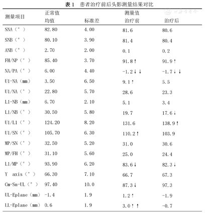 覆盖基本正常,下前牙直立,上前牙略唇倾,上下牙列轻度拥挤,Spee曲5 mm。(图1)