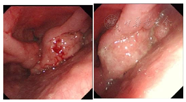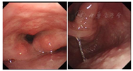 纤维喉镜检查:右侧梨状窝及劈裂环后肿物,下咽部右侧梨状窝可见菜花样肿物(活检),环后区受侵犯,右侧声带活动受限,左侧声带活动正常。(图1)