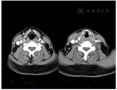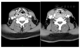 头颈部增强CT检查:右侧梨状窝处软组织增厚,局部形成肿物,边界不清楚,最厚处约1.4 cm,不均匀明显强化,侵及右侧杓状会厌襞及环后区,与右侧甲状软骨板关系密切。右侧颈中下深组、颈后三角区见数个肿大淋巴结,不均匀强化,大者短径约1.1 cm。余双侧颈深链见多发形态饱满淋巴结,大者短径约0.7 cm。(图2)