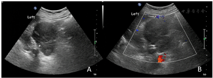 入院后完善血尿常规、大便常规及相关生化检查。肾上腺内分泌功能检查示肾素22.19 pg/ml,血管紧张素Ⅱ 241.33 pg/ml,醛固酮134.95 pg/ml,醛固酮肾素比值6.08 μg/L,皮质醇0点(CROTISOL)166.00 μg/L,皮质醇4点(CROTISOL)218.00 μg/L。胸片、心电图正常。腹部超声检查显示左侧肾上腺区可见一大小约7.6 cm×6.2 cm的低回声团,边界欠清,与左侧肾脏组织分界不清,腹腔内及腹膜后区未见明显肿大淋巴结回声。超声提示左侧肾上腺区实性占位性病变(图1)。