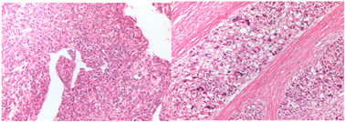 患者完善术前检查后,在全麻下行左侧腹膜后占位及左肾切除术。术中见左侧肾上腺区域可见一个不规则肿块,大小约9 cm×6 cm,和左肾分界不清,侵入肾实质内,该肿块与脾血管、胰腺粘连也较为紧密。分离肾蒂并结扎离断,从肾脏背侧向上游离至肾上腺区肿块,仔细分离肿块与脾动静脉、胰腺之间的粘连,完整切除肿块及左肾。肉眼可见肾脏12 cm×7 cm×7 cm,相连输尿管8.0 cm×0.3 cm,肾上极见8.0 cm×7.5 cm×4.0 cm灰白间黄结节,边界尚清。术后病理结果显示为左侧肾上腺皮质肿瘤,侵及肾实质,符合ACC伴部分坏死,肾脏被膜、肾窦、输尿管切缘及肾门管腔切片上未见肿瘤累及(图3)。免疫组化染色示肿瘤细胞EMA(−)。CK8/18(−),CD99(部分+),a-Inhibin(+),Calretinin(−),Syn(部分+),CgA(−),MelanA(+),S-100(−),P53(−),Ki67(热点区LI:30%),PAX8(−),PAX2(−),RCC(−),CD10(−),CK7(−),CK20(−),Villin(−)。