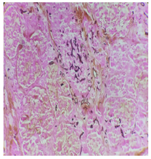 患儿2021年1月25日入院后完善相关检查临床诊断为急性淋巴细胞白血病(BCR/ABL融合基因阳性,BCR/ABL1p190阳性)。2021年1月27日给予VDLP(长春新碱+柔红霉素+左旋门冬酰胺酶+泼尼松)诱导化疗。7月29日患儿出现化疗后持续高热,热峰39.5°C,鼻皮肤黏膜破损,完善血mNGS检测检出德式根霉菌,给予静滴美罗培南40 mg/kg、每8小时1次,静滴两性霉素B脱氧胆固醇硫酸脂4 mg/kg、每日1次,泊沙康唑0.5 ml/(kg·d),分2次口服治疗。10月30日患儿出现鼻塞,流涕症状,体格检查双侧鼻腔黄脓性痂皮及干酪样黑色坏死物,口腔上腭沿正中线方向可见一条形褐色溃疡面,范围约1.5 cm×0.5 cm。完善鼻窦CT检查示双侧鼻腔内异常密度影,双侧上颌窦、筛窦、蝶窦及额窦黏膜不均匀增厚,软硬腭交界区不规则透亮影,局部软组织缺失。鼻内镜检查见双侧鼻腔较多干脓血痂附着,鼻腔分泌物真菌涂片检出根霉菌(图3)。12月2日全麻手术清理痂皮及坏死物,见鼻中隔部分骨质坏死,鼻中隔穿孔,穿孔大小约3.0 cm×3.0 cm,前至下鼻甲前端水平,后至后鼻孔水平,上至上鼻甲下缘水平,下至鼻底。清理物留送病理示毛霉菌感染(图4),继续两性霉素B脱氧胆固醇硫酸脂4 mg/kg、每日1次抗真菌治疗。
