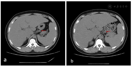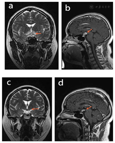 为进一步诊治,将患者收治入院。考虑到LCH多为多器官累及,完善了相关检查。甲状腺实验室检查:T3 1.33ug/L,T4 34.40 ug/L,FT3 4.46 pmol/L,FT4 5.62 pmol/L,ATG-Ab 161.2 kU/L,TPO-Ab 40.8 kU/L;24小时尿量7600 ml,尿比重(折射仪法):1.0027;颅脑MRI平扫提示鞍上池病变(鞍上池区见结节状异常信号灶,呈稍长T1稍长T2信号,边界欠清,大小约2.3 cm×1.6 cm);腹部CT示肝胃间隙、后腹膜多发淋巴结肿大。