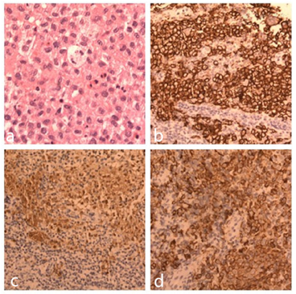 病理学检查:甲状腺右侧叶结节及右颈部软组织肿块穿刺组织镜下均可见成团的中等大小的细胞弥漫排列,疏密不一,细胞呈卵圆形,胞质中等丰富嗜伊红色;核形不规则,呈圆形或肾形,可见明显的核沟、核折叠呈咖啡豆样、锯齿状或分叶状。核染色质纤细、核仁不明显,有轻度的核异性。偶见核分裂象不明显。甲状腺右侧叶结节瘤细胞间混有少量淋巴细胞,右颈部肿块瘤细胞累及横纹肌。免疫细胞化学染色:均为CK[-],Vim[+],S100[+],CD1a[+],Langerin[+],CD163[+],CD68[-],CD3[-],CD20[-],CD34[-],Ki-67[+]<5%。