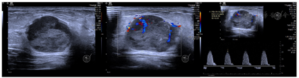 灰阶超声及多普勒超声提示:左侧乳腺10点方向,距乳头3 cm处探及大小为30.0 mm×24.4 mm的椭圆形、低回声结节,结节边界清楚,形态欠规则,部分边缘呈微分叶,内部回声不均匀,后方可见回声增强;CDFI示结节周边及内部可见条索状及点棒状血流信号,Adler分级2级,RI=0.81(图1)。
