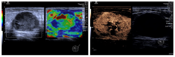 乳腺纤维腺瘤的灰阶超声征象与MCB有重叠,二者时常难以鉴别。而联合多普勒超声、弹性成像及超声造影可以有效提高超声诊断的特异性。大部分MCB的血供较为丰富,Adler血流2-3级,表现为高阻力指数(RI>0.7)动脉频谱[7],与纤维腺瘤有着较为明显的区别(Adler血流0-1级,低阻力指数动脉频谱)。但多普勒超声反映的血流信号以及阻力指数与超声仪器、超声医师的操作手法有关,存在一定的主观性。而超声造影则可通过显示造影剂微泡的运动、分布,定量反映病灶区域的微循环血流灌注。髓样癌的超声造影表现为边界清晰、均匀的强化和较高的平均峰强度值,提示其存在丰富的血供[8]。此外,超声弹性成像通过反映病灶的硬度,在一定程度上有助于良恶性病灶的鉴别诊断。但既往研究发现弹性成像对MCB的鉴别存在一定争议。有研究认为MCB的弹性成像评分与纤维腺瘤无显著差异[7],而另一部分研究者则认为由于MCB周边存在纤维结构,其周边硬度较大,与纤维腺瘤有显著的差异[9]。故弹性成像在鉴别MCB中的应用仍需进一步研究。