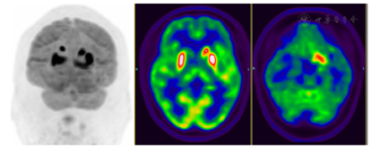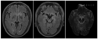MRI:左侧基底节区及左侧海马在T2 Flair及DWI上见片状稍高信号,缺血性改变(图1)?18F-FDG PET/CT(发病20 d):双侧尾状核体部、左侧尾状核头、双侧壳核、左侧颞叶内侧(包括左侧海马-杏仁核复合体)、左侧额叶内侧及左侧岛叶代谢增高,全身未见明确恶性肿瘤征象(图2)。