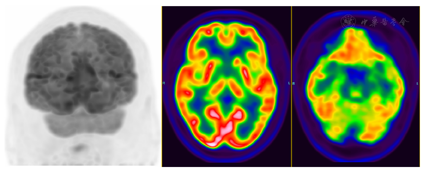 治疗半个月后,患者夜间睡眠不自主运动及言语增多现象均缓解,白天肢体不自主运动次数减少。复查血清抗LGI1抗体1∶100,抗IgLON5抗体1∶10,抗体滴度较前下降。3个月后随访:睡眠已恢复正常,左上肢不自主运动消失,记忆力明显好转。治疗3个月后复查18F-FDG PET/CT示原双侧尾状核体部、左侧尾状核头、双侧壳核、左侧颞叶内侧(包括左侧海马-杏仁核复合体)、左侧额叶内侧及左侧岛叶代谢增高均基本消失;右侧尾状核头及左侧颞叶内侧代谢较对侧减低(图3)。