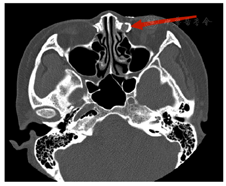 双眼裸眼视力0.8,眼压正常,眼球前后节结构未见明显异常。左眼泪囊区按压可见少许黏稠样黄白色脓性分泌物反流,上下泪小点位正,形圆。泪道冲洗:右眼上下泪小点进针,触及骨壁,冲洗液入咽喉,无反流,不伴脓性分泌物;左眼上下泪小点进针,触及骨壁,冲洗液不入咽喉,上冲下返,下冲上返,伴有黄白色黏稠样脓性分泌物,不伴血性分泌物。庆大霉素尝味实验(−)。双眼前节(−),晶状体透明,眼底未见明显异常。泪道CT造影检查:左眼泪囊窝可见造影剂残留,部分充盈缺损(图1)。