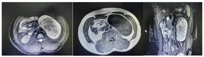 影像科意见:肾脏增强MRI提示左肾下极见不规则肿物影,T2WI及T2WI/FS呈混杂高信号,内见多发点片低信号,T1WI/DUAL同相位等低信号,倾向良性或低度恶性间叶组织来源可能大。