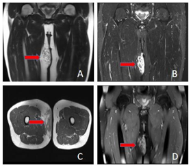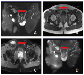 木村病(Kimura’s Disease,KD)又称嗜酸性粒细胞增多性淋巴肉芽肿,是一种罕见的以淋巴结、软组织及唾液腺损害为主的慢性炎性肉芽肿疾病。病因不明。多见于亚洲人群,在各年龄段均可发病,以中青年男性多见,男女发病比例约(3.5-7):1。好发于头颈部(腮腺多见),亦可发生于其他少见部分,如腋窝、前臂、腹部、腹股沟等,多为单侧发病,双侧少见。该病发病缓慢,临床症状不明显,早期病灶质地较软,随病史延长逐渐变硬,局部皮肤可有瘙痒和色素沉着。多数患者外周血嗜酸性粒细胞计数明显高于正常值上限,可合并血清IgE升高,对诊断具有重要意义。我们报道一例少见发病部位(大腿)木村病的MRI表现,旨在提高对少见发病部位木村病影像学表现的认识。