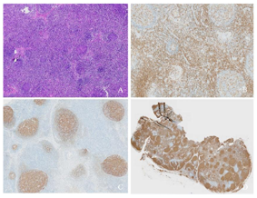 诊断:患者行超声检查及MRI增强检查明确右大腿内侧皮下脂肪层内占位及同侧腹股沟区肿大淋巴结,完善相关术前检查后,行大腿肿物切除及同侧腹股沟区淋巴结清扫,术后病理提示:右大腿肿物及腹股沟区淋巴结木村病(嗜酸性粒细胞增生性淋巴肉芽肿)(图4),免疫组化结果:CD68(散在+),CD1a(局灶+),S-100(局灶+),CD38(散在+),CD3(T细胞+),CD21(FDC+),CD20(B细胞+),ki67(生发中心高+)。