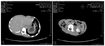 上腹部增强CT(本院):1.右侧腹膜后胰头后方不均质肿块影,内合并出血,考虑嗜铬细胞瘤?2.左侧肾上腺内支略粗;3.双肾盂略饱满,双肾均为双支肾动脉供血,见图1。