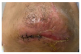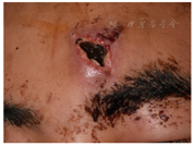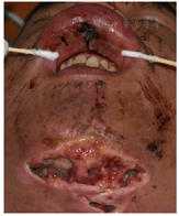 颏下、上唇黏膜侧、额部各见长约5 cm、3 cm及2 cm的创口,周围皮肤红肿、紫绀色,触压痛明显,各创面内见大量蛆虫蠕动,创面呈蜂窝状,见大量的腐败组织和黑褐色分泌液,左前臂肿胀、活动受限。