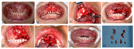 (2)拔除滞留乳牙及4枚多生牙(图3):翻瓣显露唇腭侧骨板,超声骨刀局部去骨,逐个显露多生牙,分别拔除。