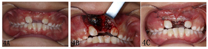 (1)切口设计(图3A):STA局部浸润麻醉下,唇侧自53近中,沿52、51、61、62龈沟到63远中做梯形切口。腭侧沿53到63龈沟做水平切口。