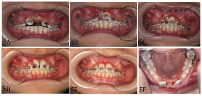 (1)图5A:2020年12月上颌部分牙黏结托槽,利用弹力线牵引埋伏11、12。