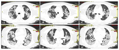 现病史:2022年12月下旬,患者居住地新冠病毒肺炎疫情流行,患者多名家人先后感染。1周前患者开始发热(2023年1月2日),测体温在38.5℃左右波动,口服安乃静、祖卡木颗粒可暂时退热,伴阵发性干咳,体力明显变差,日常活动即出现胸闷、气憋、心悸,且进行性加重以致无法忍受,家属带患者前往当地医院就诊。给予吸氧、平喘治疗,效果差,检查新冠病毒抗原阳性,新冠病毒核酸阳性,肺CT提示病毒性肺炎,因病灶弥漫、面积大,病情危重,当地医生与患者家属沟通病情后于1月8日将患者转诊至本院急诊,复查新冠病毒抗原阳性。于1月9日分诊至我科住院,病程中,患者神志清,精神差,间断发热,发热时间无规律,阵发性干咳,食欲减退,大小便排泄正常,夜间睡眠欠佳,体重变化不详。