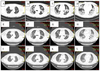 经过治疗,患者发热、胸闷、气憋症状消失,咳嗽减轻,呼吸衰竭得到纠正(表4),新冠病毒被清除(表1),同时食欲改善,进食恢复,血象、血凝及生化指标逐渐恢复至正常水平(表2、表3、表5),各炎症标志物、N端钠尿肽基本降至正常水平,未继发真菌、细菌感染(表6)。1月29日复查肺CT显示肺部病灶面积较入院时吸收(图2A~2H),继续观察1周,于2月3日病情好转出院,叮嘱患者居家时继续氧疗,坚持俯卧位通气与呼吸操锻炼,口服利伐沙班抗凝(每次10 mg、1次/d),加强营养支持,患者肺功能明显改善,不吸氧状态下日常活动不受限,3月22日再次复查肺CT提示双肺病毒性肺炎吸收期改变,较1月29日范围缩小(图2I~2L);疾病顺利恢复,目前处于呼吸康复锻炼过程中。