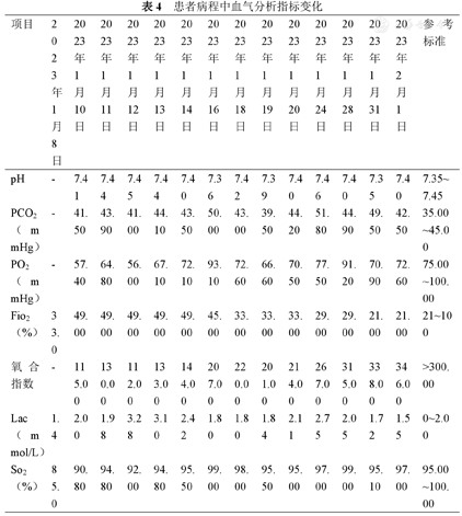自2019年12月以来,新型冠状病毒在短短百天内席卷全球,形成全球大流行[1]。典型病例表现为发热、乏力、干咳等呼吸道感染症状,严重者可在发病1周左右出现胸闷、呼吸困难,并快速进展至急性呼吸窘迫,继发休克、酸中毒和多脏器功能衰竭,导致患者死亡[2,3,4]。历时3年,我国成功建立起群体免疫屏障,危重病例大幅减少,并于2023年1月8日起恢复"乙类乙管",解除封控后,全国多地出现新冠病毒感染暴发流行,部分未接种疫苗的老龄患者和存在心肺基础疾病、免疫受损的患者短时间内集中发病且病情危重,给医院收治造成较大压力,现将1例重症病例成功救治过程分享如下。