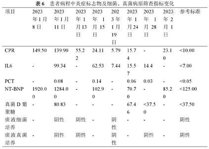 在与患者及其家属充分沟通后我科继续使用面罩氧疗(氧流量7 L/min,氧浓度49%),协助患者俯卧位通气,无法耐受时更换高侧卧位休息,给予以下治疗:5%葡萄糖注射液100 ml+地塞米松(抗炎,减轻细胞因子风暴引起的免疫损伤)5 mg、1次/d、静脉滴注,疗程10 d;5%葡萄糖注射液100 ml+维生素C(稳定细胞膜,减轻氧化应激损伤)2 g、每8小时1次、静脉滴注,疗程14 d;0.9%氯化钠注射液100 ml+盐酸氨溴索(化痰)30 mg、2次/d、静脉滴注,疗程24 d;人血白蛋白(纠正低白蛋白血症,减轻水肿)20 g、1次/d、静脉滴注,疗程6 d;吸入用复方异丙托溴铵(刺激性排痰)2.5 ml、3次/d、氧化雾化吸入,疗程24 d;布地奈德混悬液(减轻气道局部炎症,降低支气管张力)2 ml、2次/d、氧化雾化吸入,疗程24 d;低分子肝素(抗凝,减少微血栓形成)4000 IU、2次/d、皮下注射,疗程24 d;呋塞米(利尿,减轻容量负荷)40 mg、2次/d、口服,服用5 d,停用2 d;螺内酯(保钾利尿,减轻容量负荷)60 mg、2次/d、口服,服用5 d,停用2 d;厄贝沙坦氢氯噻嗪片(降血压)162.5 mg、1次/d、口服,长期服用;双环醇(护肝降酶)50 mg、3次/d、口服,疗程3周;化湿败毒颗粒(治疗咽痛、咳嗽、胸闷)10 g、2次/d,疗程10 d;乳果糖(改善便秘)15 ml,3次/d、口服,疗程1周;阿兹夫定(抑制新冠病毒复制)5 mg、1次/d、口服,疗程10 d;肠内营养(能全素+乳清蛋白粉+酸奶),每日提供热量1000 kcal。治疗过程中密切监测新冠病毒核酸及新冠病毒抗原、血球分析、血凝分析、动脉血气、血生化、炎症标志物及细菌、真菌病原筛查指标变化,根据病情及回报检查动态调整治疗(表1,表2,表3,表4,表5,表6)。