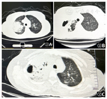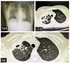 胸片(图3A):双肺多发斑片状阴影,右肺上叶可疑空洞形成。胸部CT检查(图3B):双肺多发片状及斑片状阴影伴空洞形成,病灶较前略吸收,炎性病变,结核不除外,左肺上叶陈旧性结核。2020年12月24复查胸部CT明显吸收(图3C)。