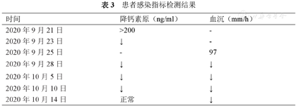 2020年9月21日肺CT(图2A):双肺炎症,右上叶为主。2020年9月28胸部CT(图2B):双肺炎症,右肺上叶为主(范围较前扩大),密度增高,右肺上叶病灶内多发空腔形成。2020年10月14胸部CT(图2C):双侧肺炎范围较前缩小,右肺上叶为主。