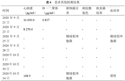 血常规、血气分析、感染指标、生化、心肌酶和心肌两项以及其他检测结果见表1,表2,表3,表4,表5,表6。