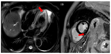 心脏增强MRI(2023年7月12日):可见左室心尖部心肌水肿(图1A),左室下壁延迟强化(图1B)。