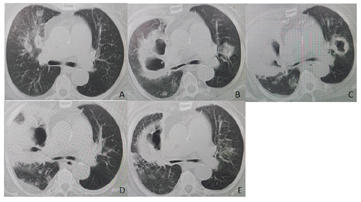 2022年9月20日,血常规+CRP:白细胞计数9.08×109/L,中性粒细胞8.01×109/L,血红蛋白98 g/L,C反应蛋白286.31 mg/L;呼吸道13种病原体检测:铜绿假单胞菌阳性;G试验和GM试验均为阴性。2022年9月22日,支气管镜检查:右肺上叶前段支气管新生物阻塞,双肺支气管炎性改变(图2A)。BALF给予活检并送mNGS检查:铜绿假单胞菌、代尔根霉、烟曲霉、EB病毒、人疱疹病毒1。病理结果:黏膜重度慢性炎,BALF未见肿瘤细胞。肺泡灌洗液真菌培养:烟曲霉;肺泡灌洗液细菌培养:耐药铜绿假单胞菌。复查CT示双肺多发空洞,考虑脓胸并空洞形成,较2022年9月19日CT片加重(图1B),给予哌拉西林钠他唑巴坦钠4.5 g 2次/d静滴联合伏立康唑0.2 g 2次/d静滴治疗3 d后患者仍有低热,伴咳嗽、咳痰、咯血,炎症指标改善不明显,调整抗生素为:伏立康唑0.2 g 2次/d静滴(2022年9月24日-2022年10月9日)、美罗培南1 g tid静滴(2022年9月27日-2022年10月14日)、硫酸阿米卡星0.8 g 1次/d静滴(2022年9月29日-2022年10月3日)。复查CT示双肺多发空洞,较2022年9月24日CT片右肺病变范围增多(图1C)。遂予以结合药敏给予加用两性霉素B胆固醇硫酸酯体2 mg(50~200 mg)泵入及两性霉素B 5mg 2次/日雾化(2022年9月29日-2022年10月10日)抗感染治疗辅以地塞米松3 mg 1次/d静脉注射激素抗炎。考虑患者感染重,治疗难度大,院内组织多学科讨论后,先后行气管镜下两性霉素B局部注射治疗3次。患者症状和氧合逐渐改善,复查CT示双肺多发实性密度并空洞,局部伴气液平,空洞较前缩小,双肺部分斑片影新增(图1D)。10月11日CT示双肺多发实变并空洞,局部伴气液平,较2022年10月4日CT吸收好转较(图1E)。复查气管镜示右中叶管口较前改善(图2B)。治疗期间多次复查曲霉感染相关指标:曲霉菌IgG抗体均<31.25 AU/ml;曲霉半乳甘露聚糖测定均<0.499。