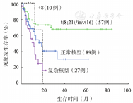 将89例达到CR并接受巩固治疗的CN-AML患者及94例达到CR并接受巩固治疗的非正常核型患者的RFS及OS时间进行比较,结果显示CN-AML患者的RFS(P=0.012)及OS时间(P=0.024)均短于t(8;21)/inv(16)患者;与+8患者相比,差异无统计学意义(P>0.05);与复杂核型患者相比,RFS时间较长(P=0.028),OS时间差异无统计学意义(P>0.05) (表3、图1、图2)。