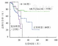 本研究结果显示+8患者1~2个疗程诱导CR率、RFS及OS时间与CN-AML患者差异无统计学意义,但+8患者病例数较少,结论有待于进一步证实。复杂核型患者被归为预后较差组,本次研究中,复杂核型患者的1~2个疗程诱导CR率及RFS时间明显差于CN-AML患者,但OS时间与CN-AML患者的差异不具有统计学意义,这可能与部分患者随访时间较短有关。