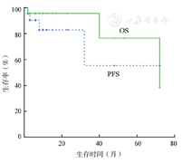 30例患者接受化疗,有明确疗效者25例。平均化疗4(2~8)个疗程,CR率56.0%(14/25),PR率36.0%(9/25),ORR 92.0%;中位随访10(2~72)个月,中位PFS、OS时间分别为32、72个月,3年PFS、OS率分别为44.7%、76.5%(图1)。其中含利妥昔单抗化疗组11例,ORR 100.0%(11/11),CR率63.6%(7/11);不含利妥昔单抗化疗组14例,ORR 78.6%(11/14),CR率50.0%(7/14);两组患者ORR、CR、PFS、OS率差异均无统计学意义(P值均>0.05)。此外幽门螺杆菌(helicobacter pylori, Hp)根除、手术、放疗各1例,至随访结束患者均存活;2例保守治疗随访7、10个月后死于淋巴瘤扩散。4例患者治疗不详。